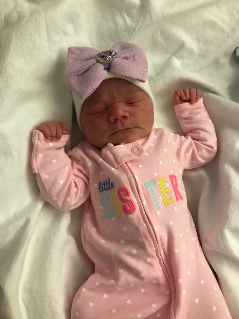 A third baby was a tougher sell for the hubby. He’s far more practical than I am, when it comes to finances and home size and I’m of the “we’ll figure it out,” mentality. Eventually he agreed and we found out baby 3 was set to arrive in May 2018. Another girl! This pregnancy was a little tougher, mostly because I had 2 toddler to chase, this time around but in the grand scheme, fairly easy. My labor with her wasn’t as smooth. Eva Marie came a day late, unlike her sisters and we found out I have a potential penicillin allergy, while in triage. Still, the delivery was the fastest and easiest of the 3 and to spite her 9 pound 1 ounce size, pushed her out in 2 pushes. This was it, my last baby, the last time I’d be in this hospital as a patient, right??