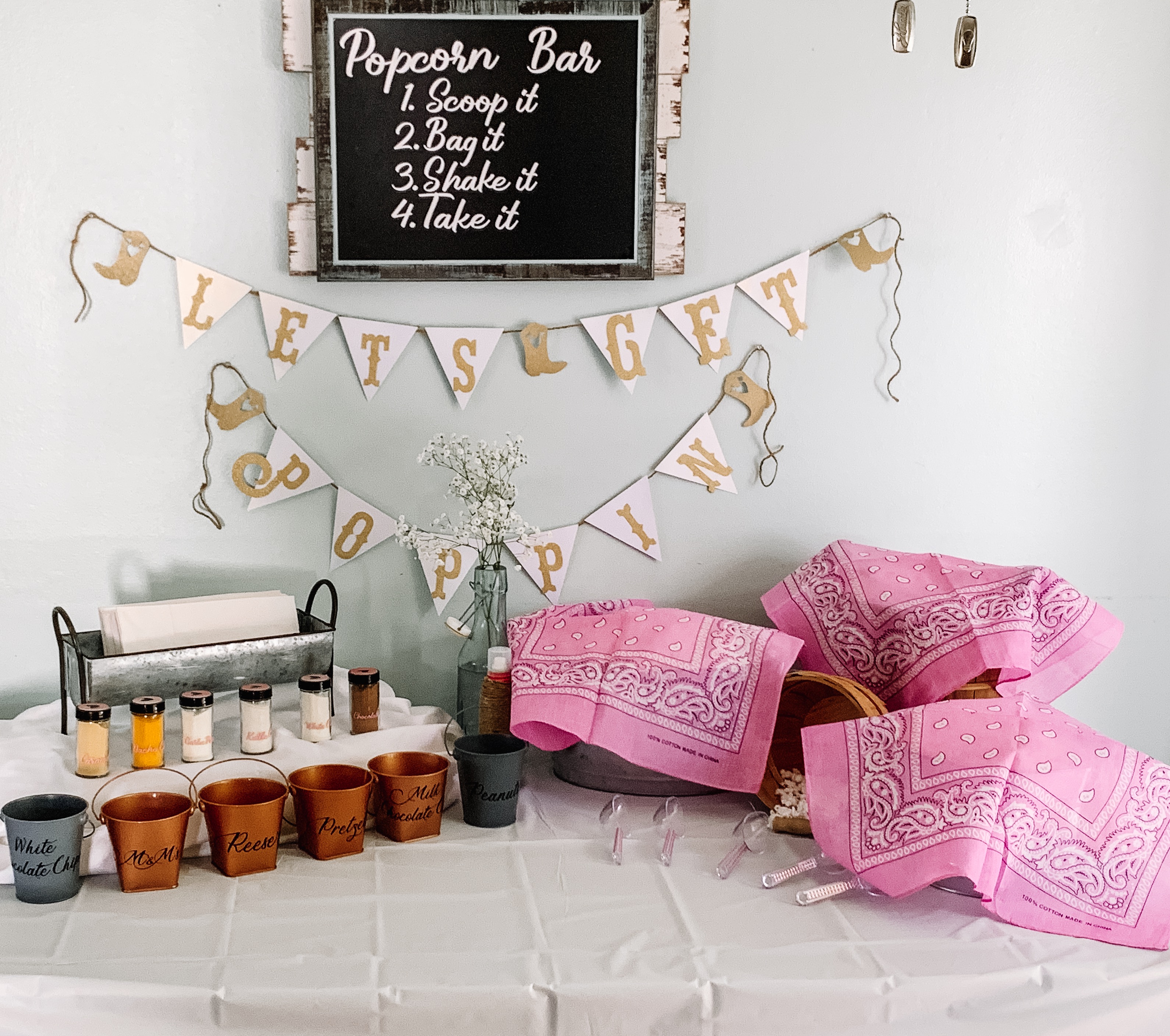 I love to find an idea on Pinterest and see how I can put my own spin on it. My favorite part of the girl’s party, was the “popcorn bar,” I put together. I used my Cricut Explore Air 2, to make a banner and cut “directions,” out of vinyl and put them on a chalkboard. I upcycled old jars from the spice rack I had to have (but sat on my counter collecting dust,) when I made my wedding registry, labeled them and put in different powdered flavorings. I used my Hamilton Beach air popper, to pop a bunch of popcorn… (way too much, if I’m being honest. I tend to have an issue with excess…) and put it in metal buckets and apple baskets. I wanted to give it a bit of a trail mix vibe, to go along with the country theme of the rodeo, so I also added peanuts, M&M’s, white and milk chocolate morsels, pretzels and mini Reese’s, as an extra treat!